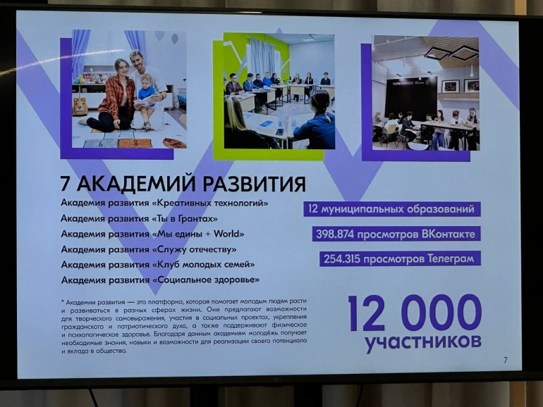 Он отметил, что основная миссия учреждения — делать мероприятия не для молодёжи, а вместе с молодёжью. Рассказал об академиях развития — платформах, которые помогают молодым людям развиваться в разных сферах. Их участниками стали 12 тысяч человек. Также акцентировал внимание на фестивале уличного искусства ПФО «ФормАрт». Отметил художника Марата Петрова, который победил в конкурсе муралов.