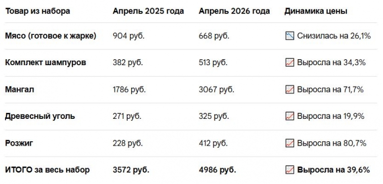 Общая стоимость «шашлычного набора» в 2026 году выросла на 11% (на 498 рублей) по сравнению с прошлым годом и составила 4986 рублей. Ниже приведено подробное сравнение стоимости всех составляющих набора на основе данных аналитиков «Чек Индекс» за 2025 и 2026 годы.