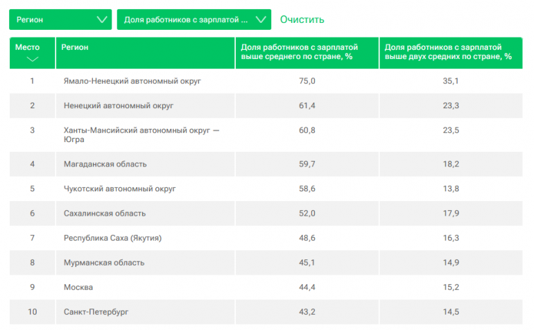 Лидерами рейтинга по доле специалистов с зарплатами выше среднего стали Ямало-Ненецкий, Ненецкий и Ханты-Мансийский автономные округа, в аутсайдерах – Ингушетия, Чечня и Кабардино-Балкария.