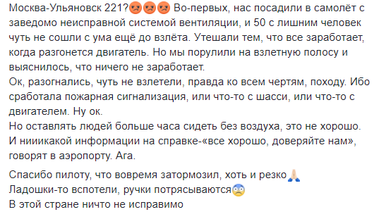 - Во-первых, нас посадили в самолёт с заведомо неисправной системой вентиляции, и 50 с лишним человек чуть не сошли с ума ещё до взлёта. Утешали тем, что все заработает, когда разгонится двигатель. Но мы порулили на взлетную полосу, и выяснилось, что ничего не заработает. Разогнались, чуть не взлетели, правда, ко всем чертям, походу, ибо сработала пожарная сигнализация, или что-то с шасси, или что-то с двигателем. Ну ок. Но оставлять людей больше часа сидеть без воздуха, это не хорошо. И никакой информации на справке - «все хорошо, доверяйте нам», говорят в аэропорту. Ага. Спасибо пилоту, что вовремя затормозил, хоть и резко.