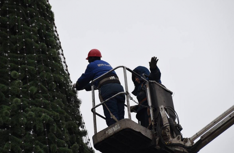 Далее рабочие Городского центра по благоустройству и озеленению займутся украшением елки новогодними шарами.