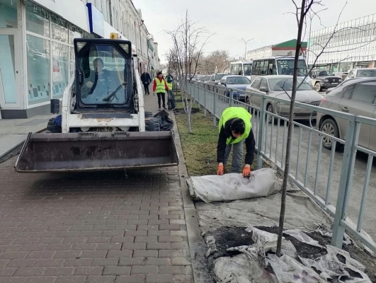 Сегодня, 27 марта, в центре Ульяновска специалисты «Горзеленхоза» убирают защитные полотна на улице Гончарова.