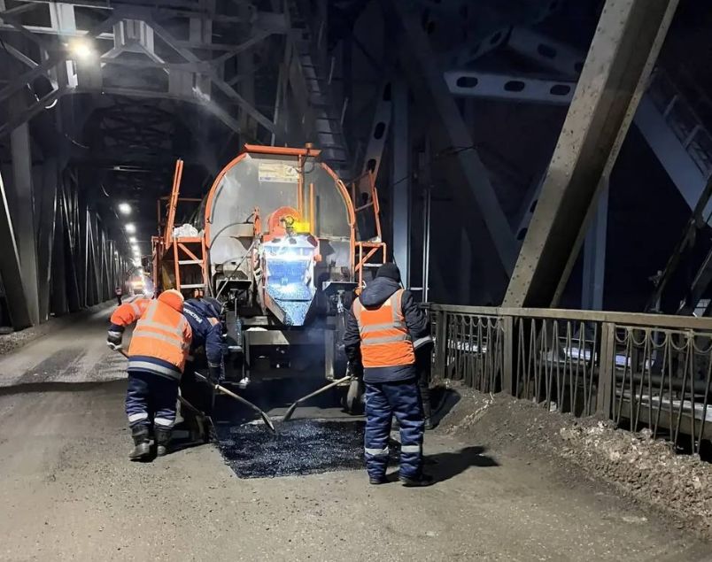 В Ульяновске прошедшей ночью на Императорском мосту с помощью литого асфальта дорожники ремонтировали примыкания к пяти новым деформационным швам со стороны Правобережья.