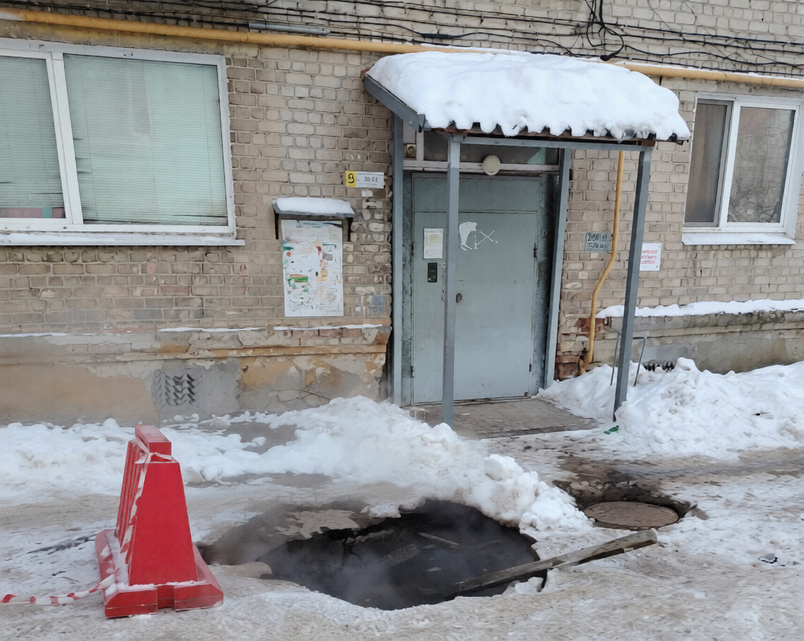 Жители сообщают, что провал заполнен водой, которая уходит в подвал многоквартирного дома.