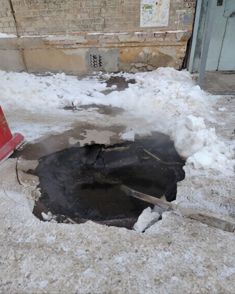 На улице Карла Либкнехта, 5 прямо перед подъездами образовался провал в асфальте. Жители просят решить проблему, так как вода утекает в подвал.