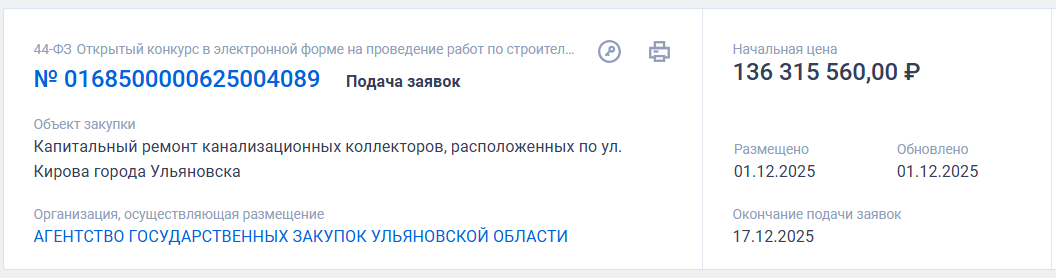 На портале ЕИС «Закупки» с 1 декабря начался прием заявок на капремонт канализационных коллекторов на улице Кирова — начальная максимальная цена контракта объявлена в 136,3 млн рублей. Подать заявку подрядчики могут до 17 декабря.