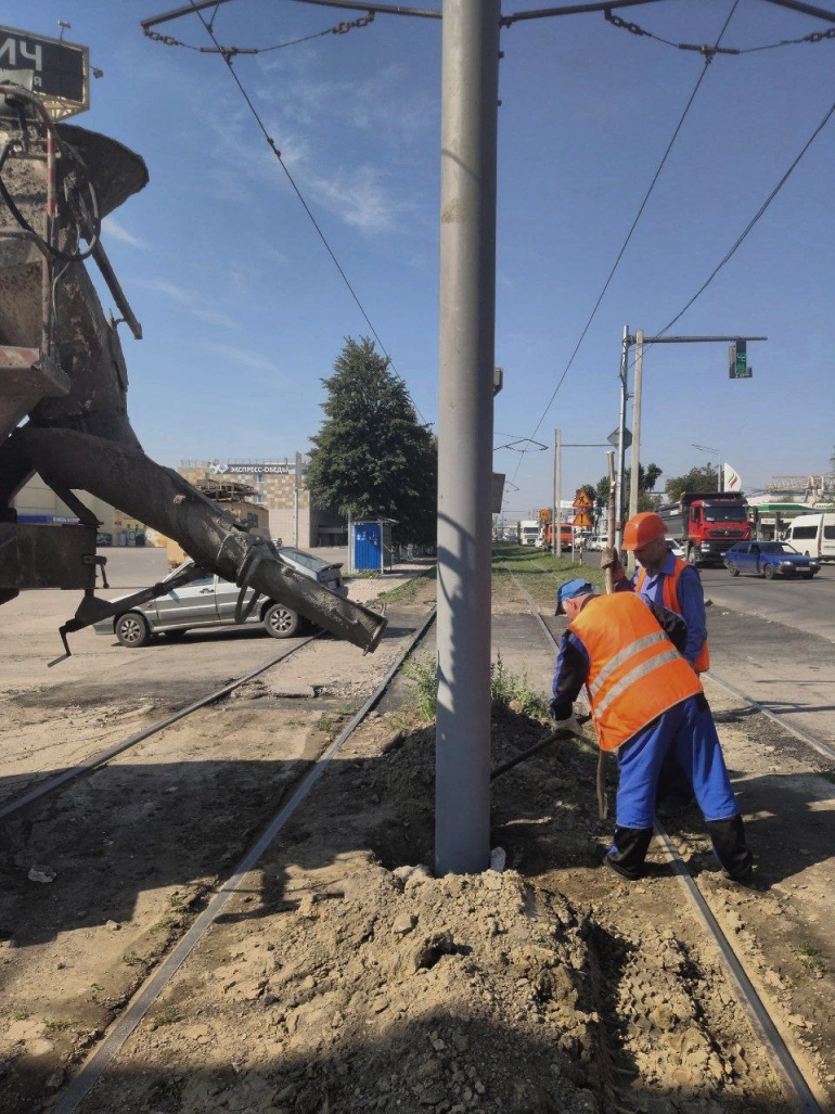 - Наши сотрудники установили новую опору контактной сети и демонтировали старый столб. Все кронштейны установлены, сеть натянута, опора залита бетоном. Передвинуть опору на несколько метров потребовалось для расширения перекрёстка. После того как мы закончили свою часть работы дорожники продолжат работы по замене асфальтового покрытия, - рассказали в «УЭТ».