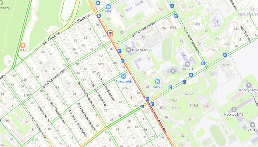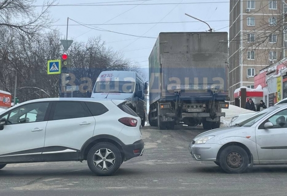 На перекрестке ул. Розы Люксембург и Любови Шевцовой прямо на трамвайных путях не разъехались фура с 67 маршруткой.