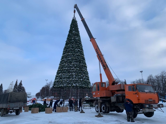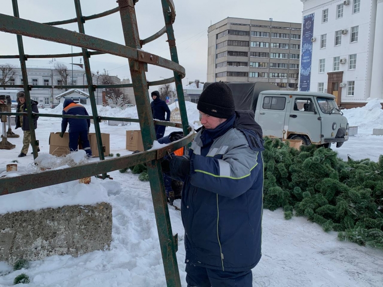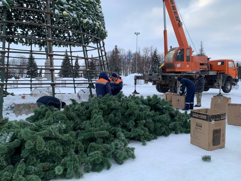 С помощью автокрана специалисты демонтировали металлическую конструкцию и декоративные еловые ветки. Потом они приступят к демонтажу остальных праздничных конструкций.