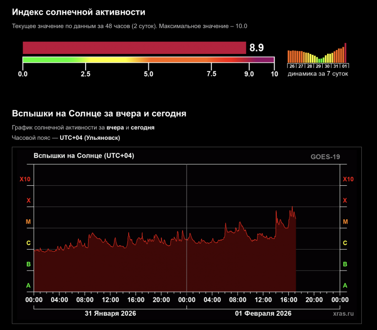 – По всем признакам Солнце уходило в глубокую депрессию продолжительностью до месяца и более. На нашем светиле в последнюю неделю января почти полностью исчезли пятна и корональные дыры, потоки рентгеновского излучения снизились в 5-6 раз по сравнению с серединой месяца, а общий индекс активности снизился до уровня около 1 из 10. Милость на гнев звезда сменила совершенно неожиданно и без каких-либо предвестников, – рассказали в телеграм-канале Лаборатории.