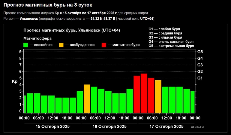 Начало магнитной бури ожидается, по предварительному прогнозу, примерно в 22:00 по мск 16 октября. Она сразу поднимется до уровня G1 (слабая), а затем после полуночи приблизится к уровню G2 (средняя).