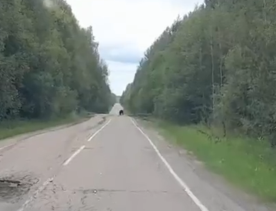 Зверь находился на расстоянии примерно 60–70 метров от людей, он вышел из леса и переходил дорогу.