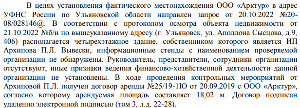 Как установил Арбитражный суд Москвы, по юридическому адресу «Арктур» нет вывесок организации, отсутствуют признаки ведения хозяйственной деятельности. Учредитель и директор общества Наталья Губина «работала» в нём удалённо — из вологодской деревни Верховье. Договор аренды офиса скрепляли электронной подписью, то есть лично никто не встречался.