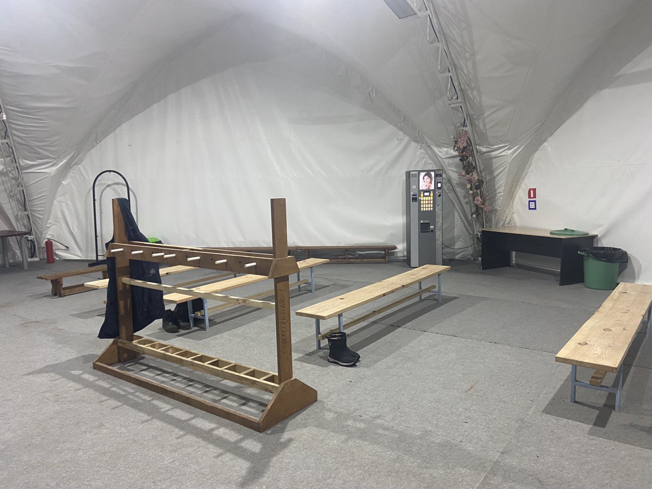 В шатре находится кофейный автомат, стоят кулеры с водой. Есть раздевалка. Точек питания в комплексе нет, но разрешено приносить еду с собой.