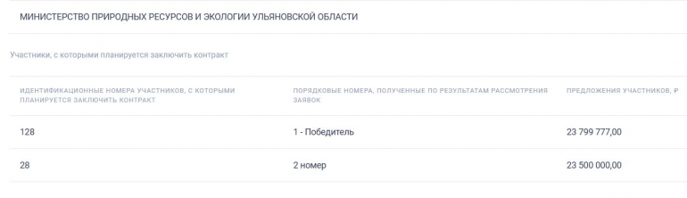 Начальная максимальная стоимость контракта составляла 24 651 333 рублей. В конкурсных процедурах приняли участие две организации. Победителем признана организация, предложившая цену в 23 799 777 рублей.