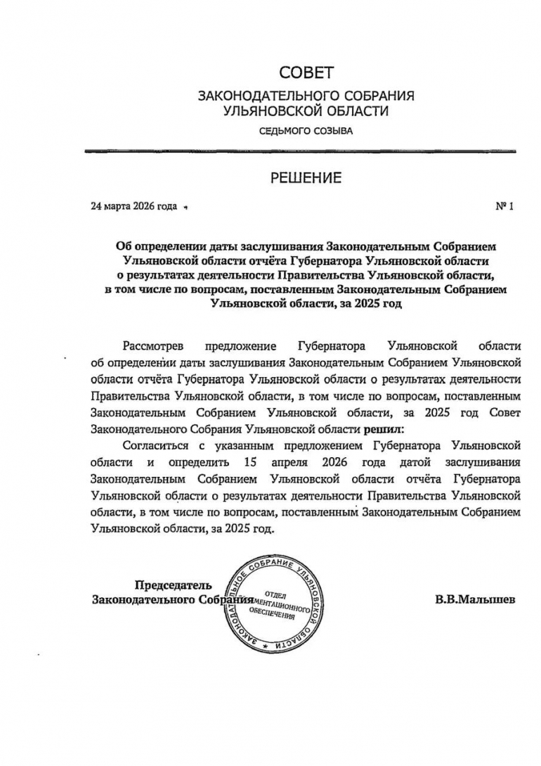 Соответствующее решение сегодня принял Совет Законодательного собрания Ульяновской области VII созыва.