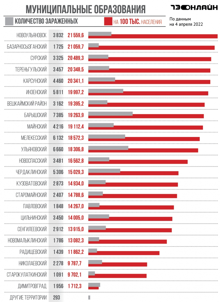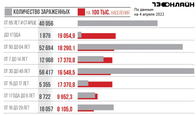 По данным на 4 апреля в регионе подтверждено 198 148 (без учета Димитровграда) зараженных за все время. Больше всего инфицированных в возрастной категории от 65 лет и старше — 40 056 (на 100 тысяч населения — 19 123,9). Следом идут:
