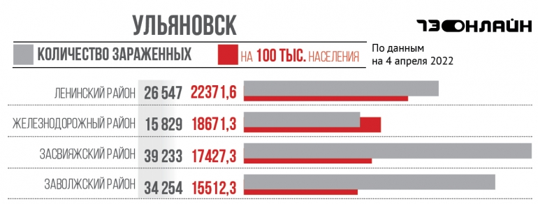 По состоянию на 4 апреля в Ульяновской области выявлено более 198 тысяч зараженных. Суточный показатель заболеваемости на 100 тысяч населения равен 32,8, что на 2,8 выше общероссийских показателей. Об этом сообщила представитель Роспотребнадзора на аппаратном совещании в правительстве 5 апреля.