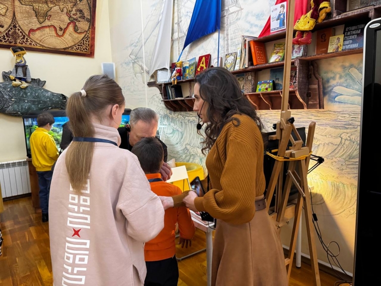 После спектакля зрители отправляются в театральный музей на специальную тактильную экскурсию. Мальчикам особенно интересно познакомиться с «настоящими» ковбойскими револьверами — ребята по очереди крутят барабаны, «стреляют» в воздух.