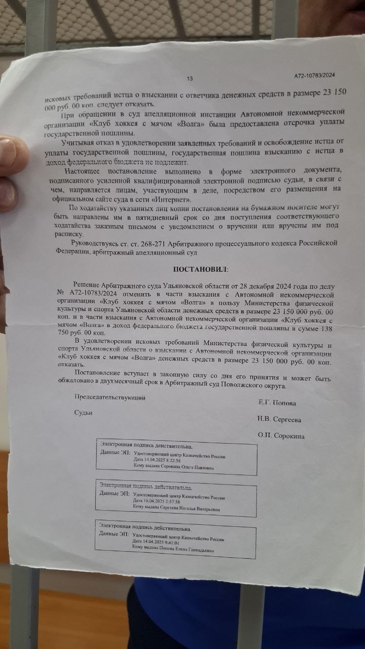 — Решения арбитражных судов вступили в законную силу. Хоккейный клуб субсидии получил правомерно и тратил их по целевому назначению. Вот фотография одного из решений апелляционного суда Самары. Правомерность использования бюджетных средств везде у клуба подтверждена. Хоккейный клуб «Волга» выиграл все арбитражные суды у министерства.