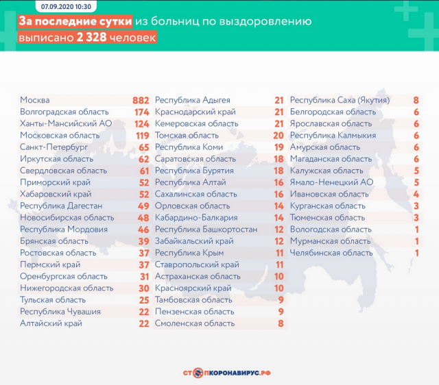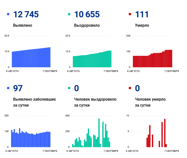 По данным федерального оперативного штаба на сегодня, 7 сентября, в Ульяновской области нет выздоровевших от коронавируса за последние сутки. Новых летальных случаев тоже не подтверждено.