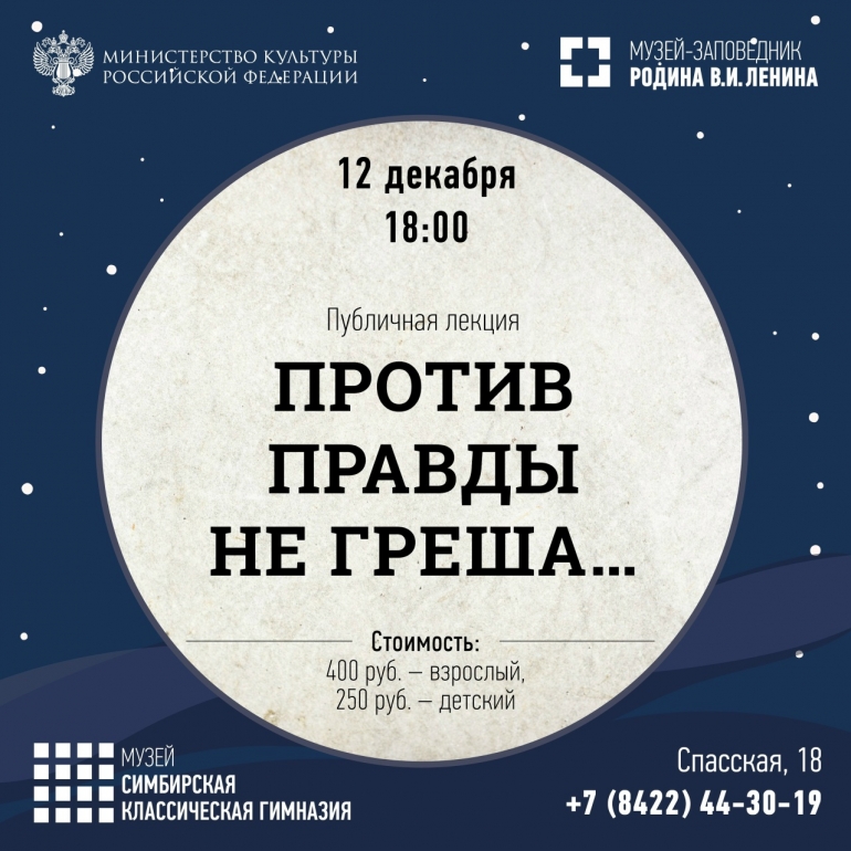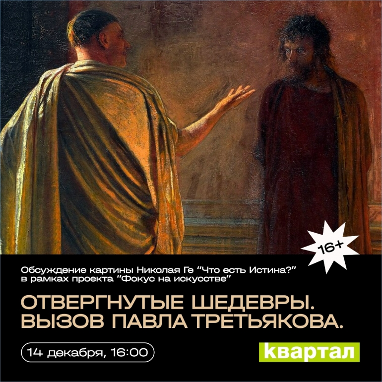 14 декабря в 16:00 в креативном пространстве «Квартал» (ул. Ленина, 78) пройдёт обсуждение картины Николая Ге «Что есть Истина?». Николай Николаевич Ге — русский живописец и рисовальщик, один из общепризнанных лидеров реалистической школы пореформенной эпохи, скульптор, теоретик искусства и писатель. Один из членов-учредителей Товарищества передвижников. Профессор и сверхштатный член Императорской Академии художеств.«„Что есть истина?“ Христос и Пилат» — картина русского живописца Николая Николаевича Ге (1831—1894), написанная в 1890 году. Относится к поздним работам художника, является частью «Страстного цикла», созданного в 1880-х — 1890-х годах. В том же 1890 году картина приобретена П. М. Третьяковым, ныне находится в Третьяковской галерее.