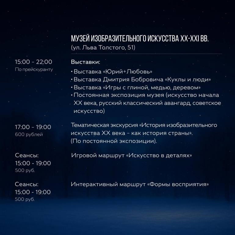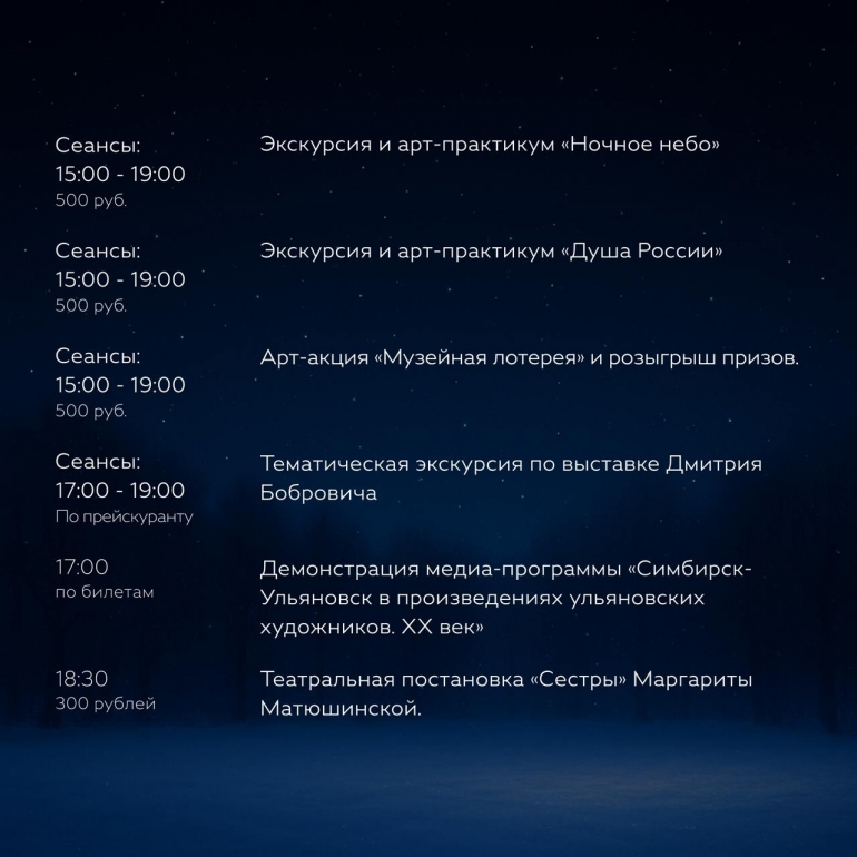 Пройдут выставки, мастер-классы, лекции и квесты. Вход в этот вечер будет платным, экскурсии, мастер-классы и лекции оплачиваются отдельно.
