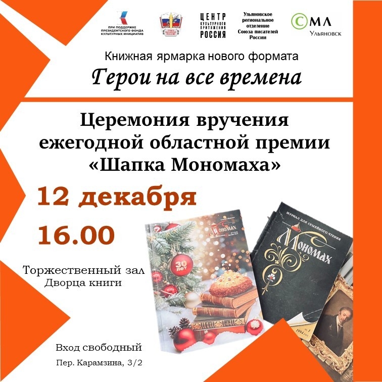 В 16:00 в зале Дворянского собрания состоится торжественная церемония вручения премий за заслуги в области региональной историографии и литературного творчества «Шапка Мономаха». Традиция вручения премии была заложена журналом «Мономах» как ежегодное присвоение Гран-при Человеку Года за заслуги в продвижении культуры, нравственности и духовности.