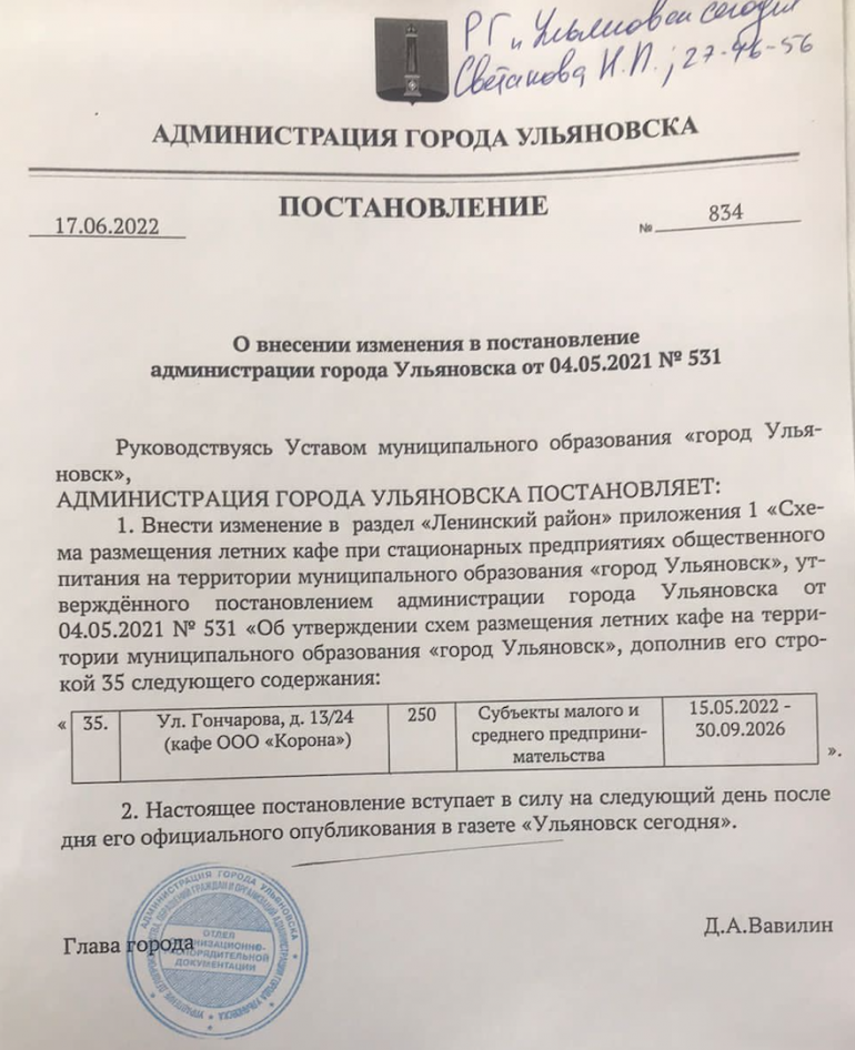 Договор аренды с Февралевым на тот момент не был официально расторгнут, но по неизвестным причинам соответствующее распоряжение подписал бывший мэр Ульяновска Сергей Панчин, будучи уже в отставке. В середине июля прошлого года летник принудительно демонтировали, вывезли мебель, несмотря на то, что до конца сезона оставалось полтора месяца — отсюда и возник скандал.