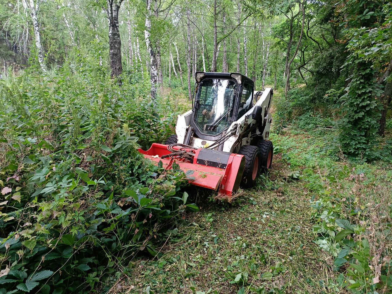 Фрезерную установку поставили на мини-трактор «Бобкэт». Она совмещена с гидравлической системой трактора и в высоком темпе расчищает парковую территорию от сорняков.