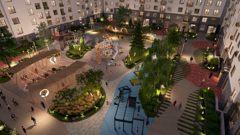MN Group позаботился о том, чтобы проводить время на свежем воздухе было интересно всем. Детям понравится придумывать новые развлечения на игровых площадках, где созданы все условия для развития воображения, коммуникативных навыков и ловкости. Взрослым и подросткам будет приятно заниматься спортом на свежем воздухе, отдыхать в лаунж-зонах или просто прогуливаться по территории комплекса.
