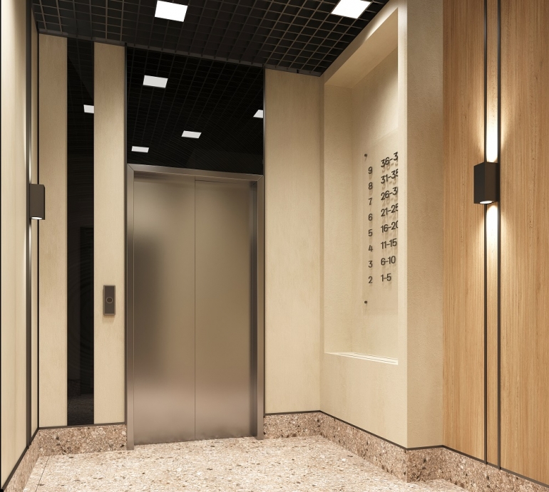 Дизайн холлов выполнен по индивидуальному проекту и поддерживает стилистическую концепцию жилого комплекса, отражая плавный переход от внешнего к внутреннему. В просторных светлых холлах с высокими потолками и панорамным остеклением можно будет в приятной обстановке почитать книгу, пообщаться с соседями, подождать курьера или даже провести деловую встречу.