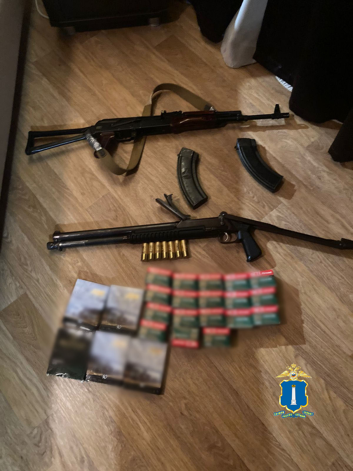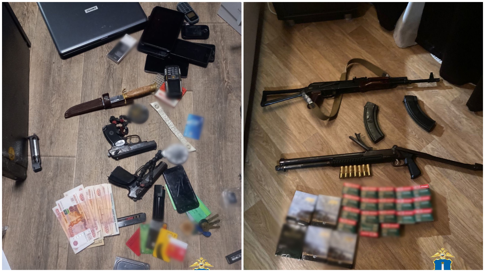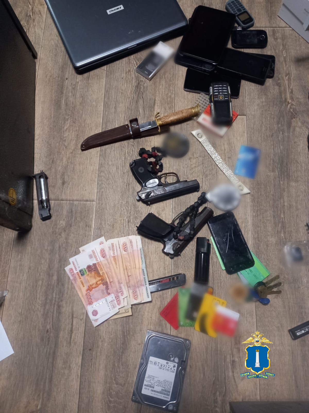 Во время более 20 обысков оперативники и следователи «изъяли атрибутику запрещенной в РФ экстремистской организации АУЕ, крупную сумму денег в рублях и иностранной валюте, банковские карты, флеш-накопители, сотовые телефоны, огнестрельное и травматическое оружие, боеприпасы, колюще-режущие предметы, которые могли использоваться в противоправной деятельности».