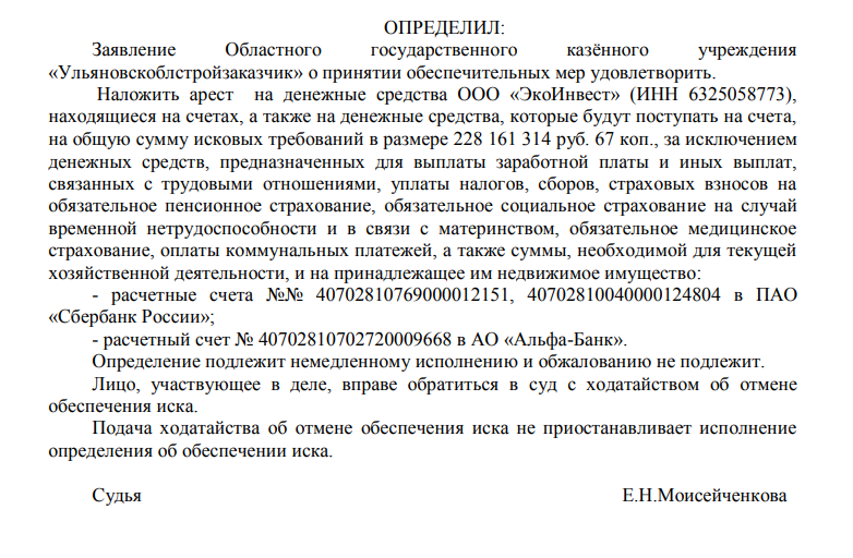 ОГКУ требует возвратить выплаченный компании аванс - 228 млн 161 тыс. рублей. Рассмотрев заявление истца, суд на первом заседании принял решение наложить обеспечительные меры и арест на денежные счета «ЭкоИнвест». Следующая встреча запланирована на 26 марта.