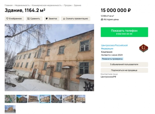 Здание двухэтажное, сделано из кирпича, его площадь — 1164,2 квадрата, цена за один — 12 884 рубля. Продавец предупреждает, что в настоящее время оно не огорожено, не эксплуатируется и находится в неудовлетворительном состоянии.