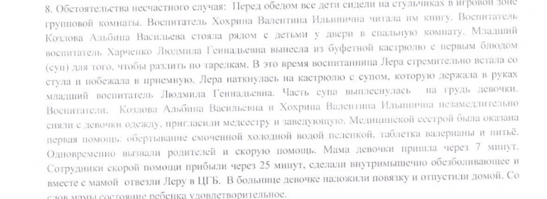 Со слов Ирины, воспитательница дважды перевела ей по пять тысяч рублей, заведующая детсадом при встрече попыталась дать еще тысячу, но она не приняла. Спустя два дня в образовательном учреждении составили акт о расследовании несчастного случая с воспитанником и пришли к выводу о том, что девочка виновата сама — «стремительно встала со стула и побежала в приемную», где «наткнулась на кастрюлю с супом, которую держала в руках младший воспитатель». Там же тщательно прописали, что сотрудники незамедлительно вызвали скорую и сняли с нее одежду. Как причину несчастного случая указали «неосторожность ребенка», особо подчеркнули, что несчастный случай не связан с образовательной деятельностью. Лица, допустившие нарушения закона и подзаконных актов — прочерк. Мероприятия по устранению причин — беседа с детьми о правилах безопасного поведения в быту и внеплановый инструктаж сотрудников. Подпись: заведующая МБДОУ № 233 О.А. Ермохина.