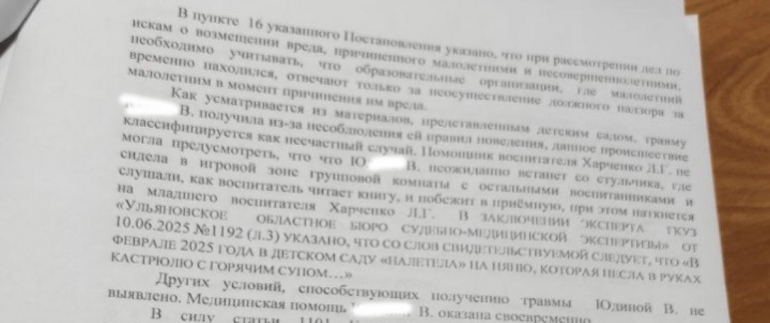 Акт расследования лег в основу позиции руководства детского сада в суде, в который с иском о защите прав ребенка и родителей обратилась прокуратура. В качестве третьего лица в процесс было привлечено Управление образования города Ульяновска. Любопытно, что и его, и ответчиков представлял одна и та же юрист по фамилии Баулина. Обосновывая отказ от исковых требований, она написала: «травму Ю**** В. получила из-за несоблюдения ей правил поведения, данное происшествие классифицируется как несчастный случай. Помощник воспитателя Харченко не могла предусмотреть, что Ю**** В. неожиданно встанет со стульчика и [...] наткнется на младшего воспитателя Харченко».
