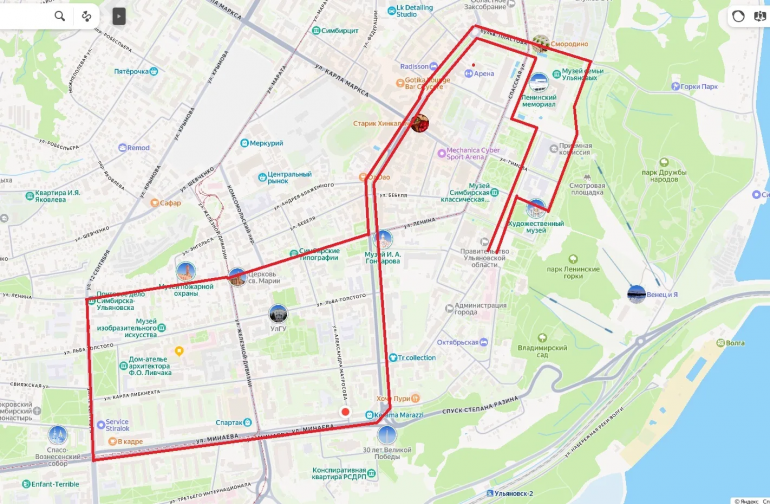 - 1–й этап (мужской) - 635 м: по Соборной площади, по эспланаде мимо памятника К.Маркса, направо мимо здания Карамзинской библиотеки с выходом на Новый Венец до конца корпуса УлГПУ;