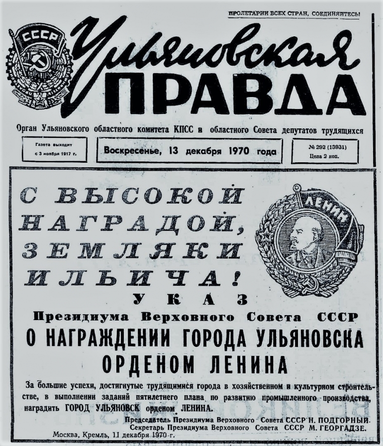 Сообщение о награждении Ульяновска Орденом Ленина. 13 декабря 1970 года