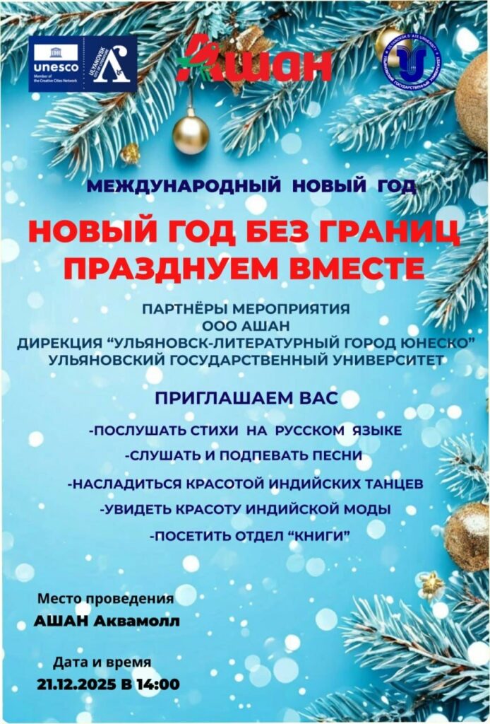 21 декабря в 14:00 в Аквамолле (Ашан, Московское шоссе, 108) пройдет международная праздничная программа «Новый год без границ. Празднуем вместе». Иностранная молодежь прочитает стихи на русском языке и споет песни, будут индийские танцы. Вход свободный.