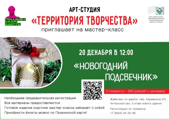 20 декабря в 12:00 во Дворце книги (переулок Карамзина, 3) участники мастер-класса научатся быстро и просто создавать новогодние подсвечники из природных материалов и маленьких баночек.