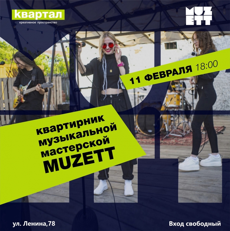 11 февраля в 18.00 состоится квартирник музыкальной мастерской MUZETT. Вас ждёт: дружественная и тёплая атмосфера; печенье и чай; живой вокал; игра на инструментах учеников и педагогического состава музыкальной мастерской MUZETT.
