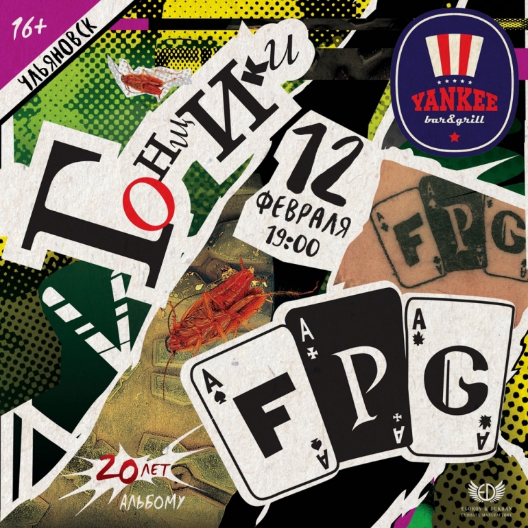 12 февраля в 19.00 в YANKEE Bar & Grill состоится концерт F.P.G. В самом начале двухтысячных, юным, но целеустремленным F.P.G удалось записать эталонный панк-рок альбом «Гонщики»!Именно с него началась долгая история успеха нижегородских бунтарей: первые ротации на радио, клипы, гастроли, выступления на крупных фестивалях и признание коллег по цеху. Бескомпромиссные, дерзкие и циничные, но с потрясающим чувством юмора – такими «Гонщиков» знают и любят поклонники настоящего русскоязычного панка.«Не отступай!», «Утренняя», «Свобода» и другие песни с культового альбома прозвучат наряду с прочими боевиками F.P.G.
