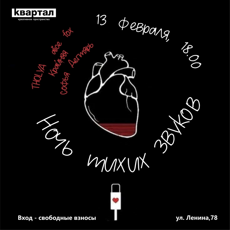 13 февраля в 18.00 в «Квартале» вас ждёт полное погружение в музыку. Ночь тихих звуков — это вечер музыки, который пройдёт в полной темноте. Единственным источником света станут телефоны зрителей. В этот вечер выступят такие исполнители как THOLY, Aalice fox, Крайняя, Софья Дегтярь.