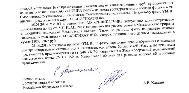 Согласно официальному ответу г-на Каплина, за порчу земли АО "Силикатчик" было оштрафовано сначала на сумму более 1 млн рублей, а затем - на 2,1 млн. рублей. Проверяющие обнаружили, что сточные воды из канализационных труб АО "Силикатчик" попали на земли лесфонда в четвертом квартале Смородинского участкового лесничества.