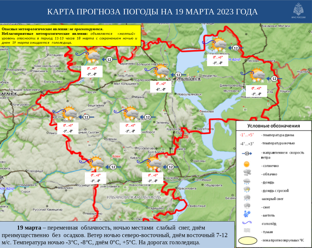 Ветер ночью северо-восточный, днём восточный 7-12 м/с. Температура ночью -3°С, -8°С, днём 0°С, +5°С. Объявляется «желтый» уровень опасности. На дорогах ожидается гололедица.