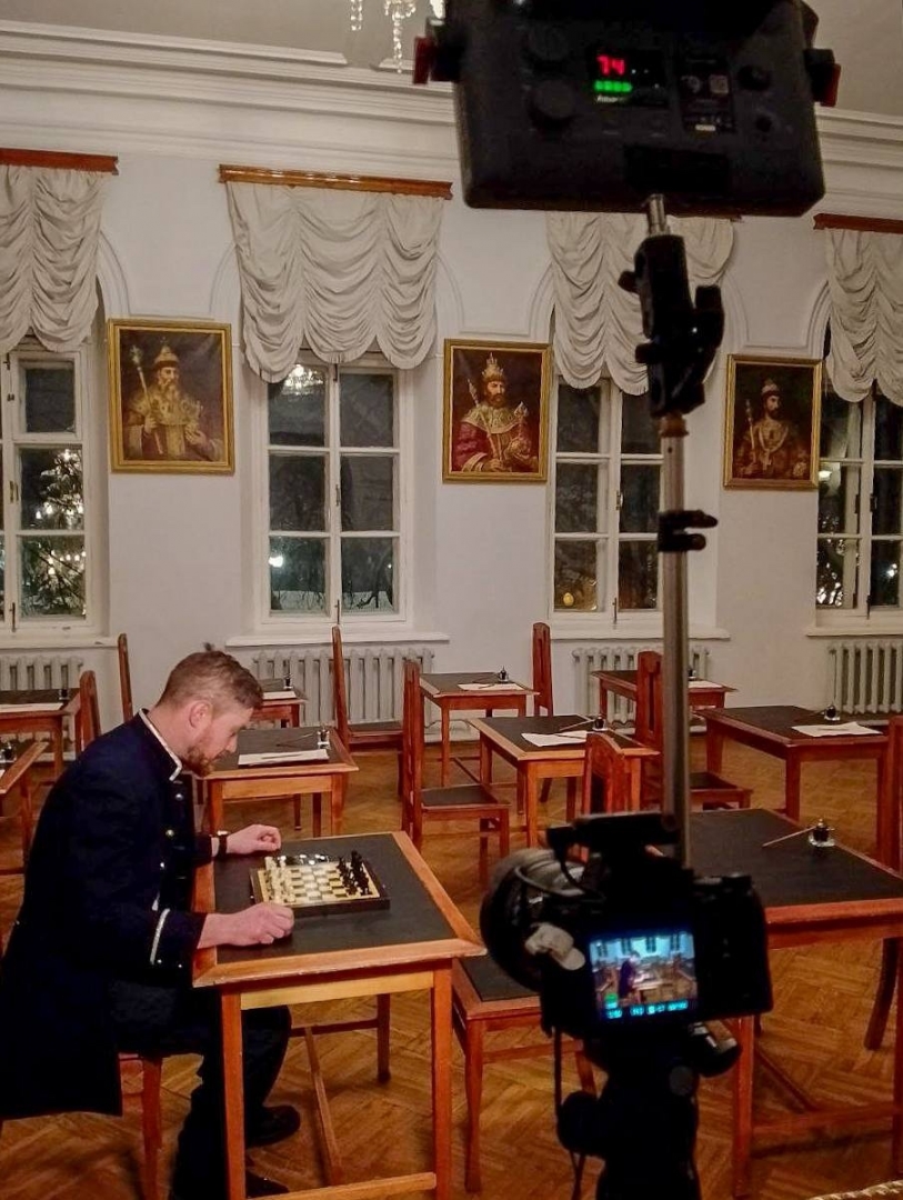 Именно по логике, как отмечается, у Владимира Ульянова в аттестате была единственная оценка «четыре». Ведущий также сыграл в шахматы в исторических интерьерах.