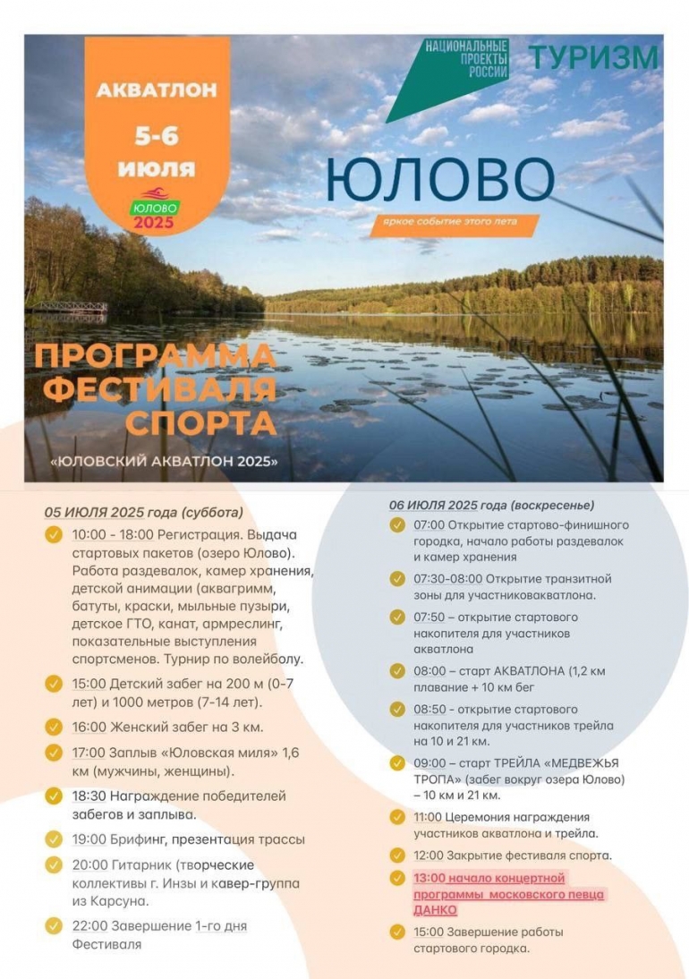 Департамент туризма сообщает, что 5 и 6 июля на берегу озера Юлово будет проходить фестиваль«Юловский акватлон», который объединит как профессиональных атлетов, так и любителей активного отдыха и семьи с детьми.