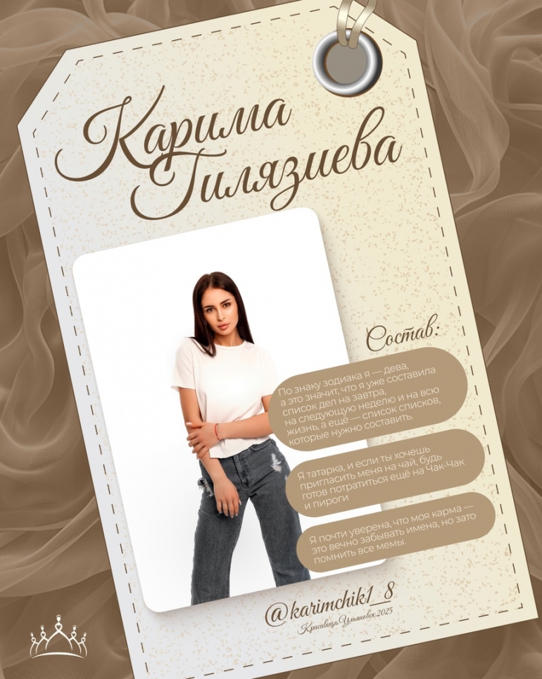 На звание «Красавица Ульяновска» претендуют десять девушек. Это номинация появилась в прошлом году и она более демократичная по критериям в рамках конкурса «Мисс Ульяновск-2025». Ее участницы, например, могут быть ниже 170 см, но внешними данными красотки ничуть не уступают высоким соперницам. Предлагаем удостовериться в этом лично и проголосовать* за наиболее достойную, на ваш взгляд, короны.
