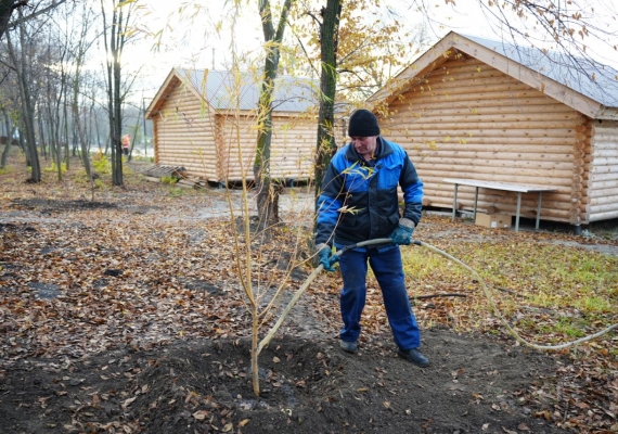 - Половину деревьев и кустарников сажаем здесь сегодня, 31 октября. Это ива плакучая и шаровидная, три ели, 13 кустарников сирени венгерской, – рассказала дизайнер учреждения Анна Россейкина.